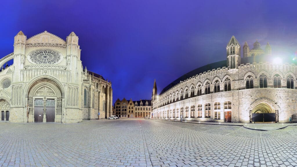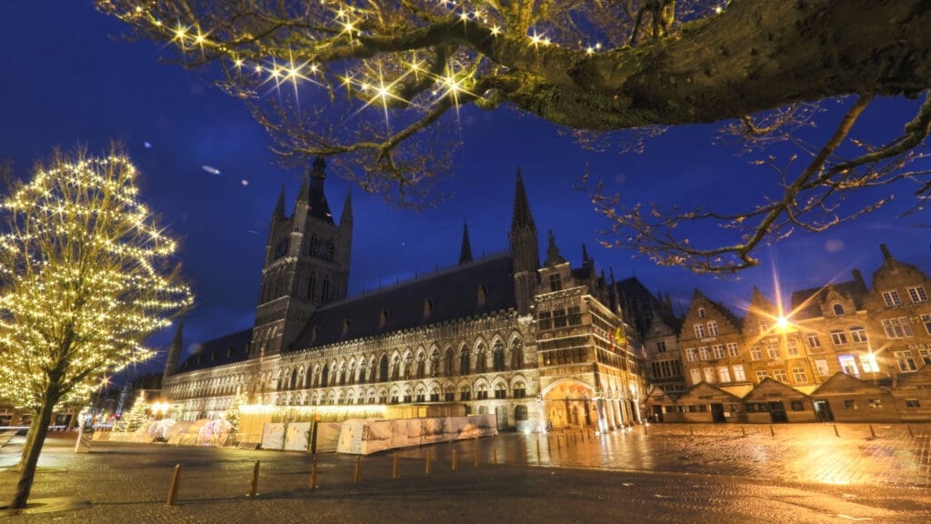 - 360°-Foto der Tuchhallen von Ypern (Sint-Maartensplein-Seite, bei Nacht):