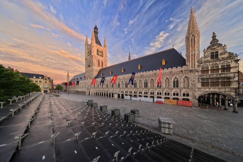 - 360°-Foto der Tuchhallen von Ypern (Seite des Sint-Maartensplein, Morgendämmerung):