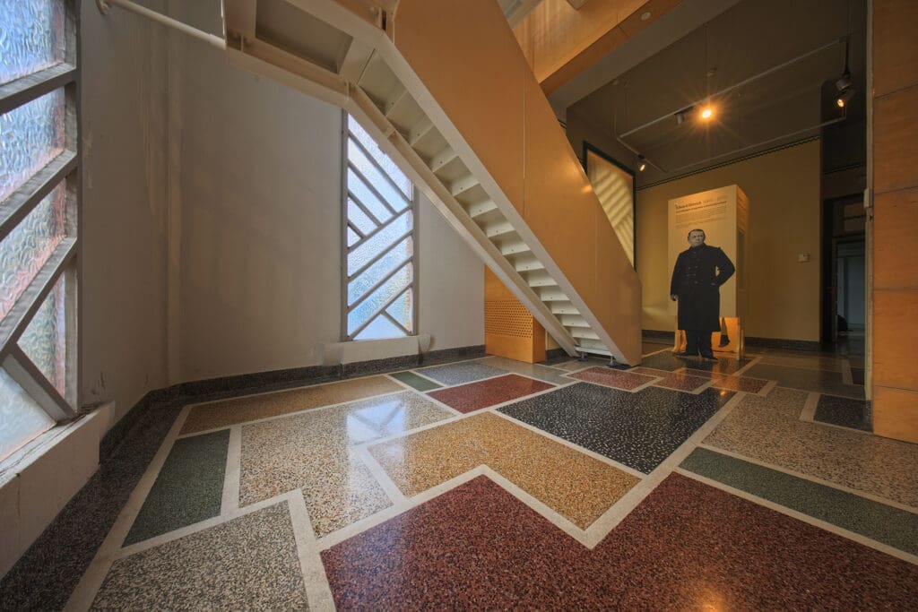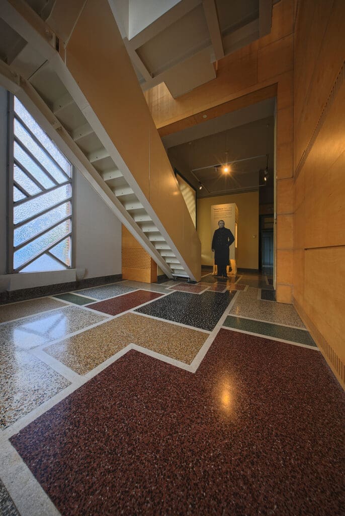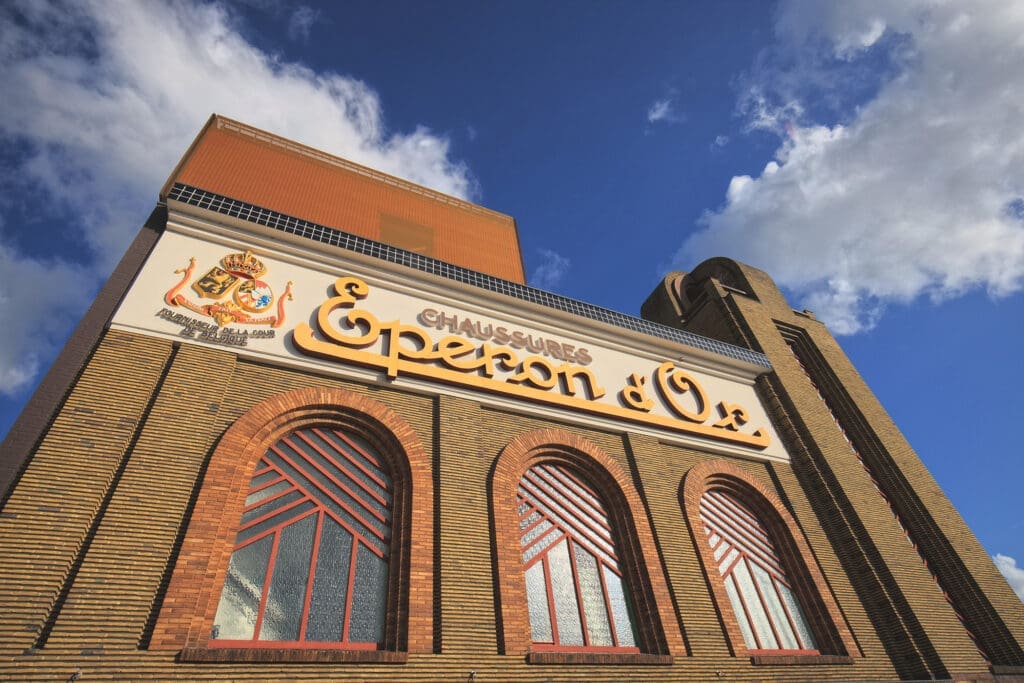 Eperon d'Or is a shoe and brush museum in a beautiful art deco building. "Eperon d'Or" literally means "golden trail." D. Decoene 's luxury shoe factory operated between 1909 and 1968. They were proud to be certified purveyors to the court (to both the Luxembourg and Belgian courts), as evidenced by the rather large Royal Arms on the front of the building. In French, of course, as it was the vernacular of the "Beau Monde" at the time. The building was built in the 1930s along the Kortrijk-Bruges railroad line to a design by the Izegem architect Charles Laloo.
