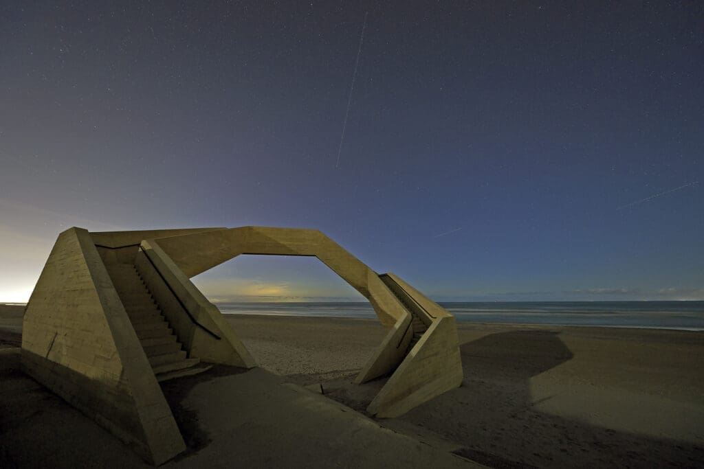 Sur le site web de Mouton Engineering, on peut lire: "Le projet fait partie de WinVorm, une plateforme pour des interventions innovantes dans l'espace public, et comporte deux volets. En bordure des Houtsaegerduinen, un peu plus loin, un point de repos et d'information sera construit.Lesdeux projets sont liés par leur matérialisation et leur conception.