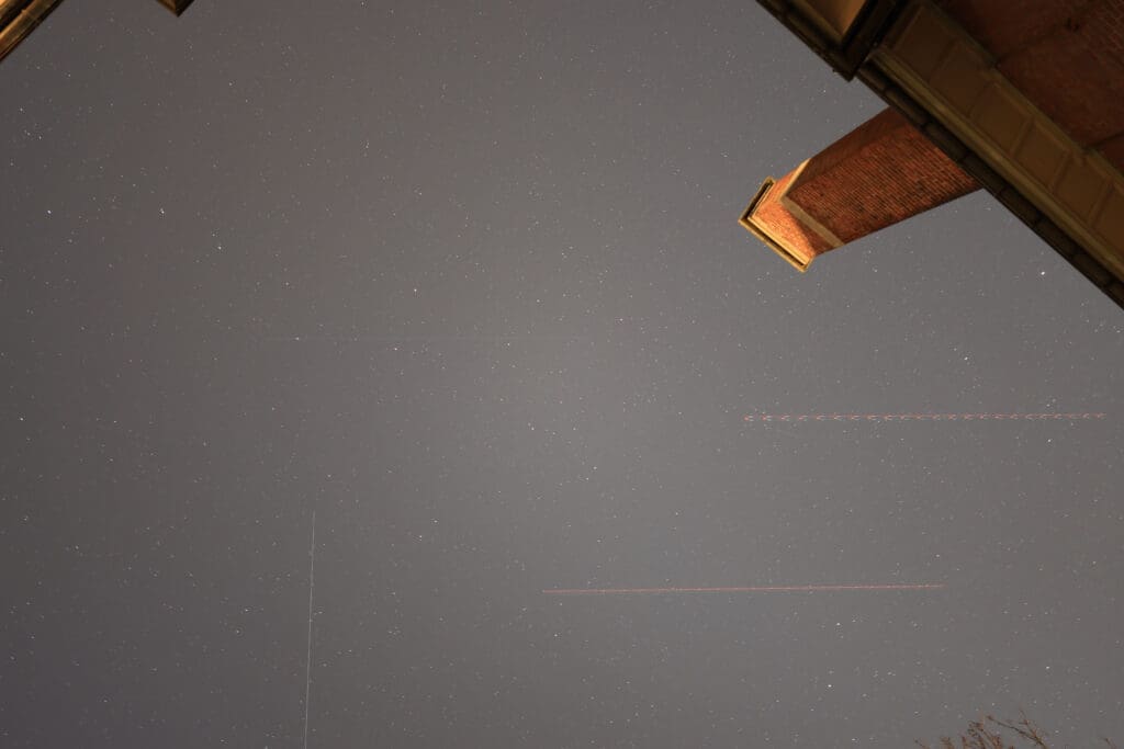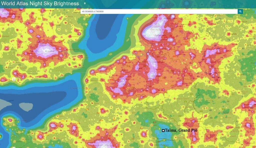 1) Un problème courant dans les photos astronomiques est que l'arrière-plan n'est pas parfaitement noir . Cela est généralement dû à une forte pollution lumineuse. La plupart du temps, la photo présente une teinte orange-rougeâtre provenant généralement des lampes au sodium jaunes qui étaient autrefois installées pour l'éclairage public. Progressivement, on passe désormais à un éclairage LED plus blanc. Ces lampes continuent toutefois à causer de la pollution lumineuse. Il est donc préférable de rechercher un endroit vraiment sombre, loin de toute zone habitée. Ces endroits peuvent être la campagne (loin des villes), les zones boisées (les Ardennes, par exemple) ou les zones montagneuses (où la densité de population est généralement plus faible). Plus le ciel est sombre, plus le fond noir sera beau. L'ensemble de la photo sera ainsi mieux mis en valeur.