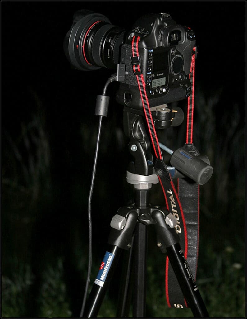Il peut faire très froid pendant la soirée et la nuit. C'est encore plus vrai lorsque le ciel est dégagé : les nuages forment en effet une couche qui empêche la température de baisser trop rapidement. Comme la température baisse considérablement et qu'il y a souvent beaucoup de vapeur d'eau dans l'atmosphère, celle-ci se transforme d'abord en minuscules gouttelettes d'eau sur les surfaces les plus froides. Il s'agit donc des surfaces telles que celles des objets métalliques, qui refroidissent très rapidement. Les surfaces en verre (lentilles) peuvent également se refroidir fortement, ce qui les recouvre d'une fine couche de gouttelettes d'eau : la rosée. Vous constaterez que lorsque vous réalisez des séries chronologiques, le contraste des photos commence à diminuer à mesure que la rosée se forme. Au final, il est même possible que les clichés deviennent totalement inutilisables.