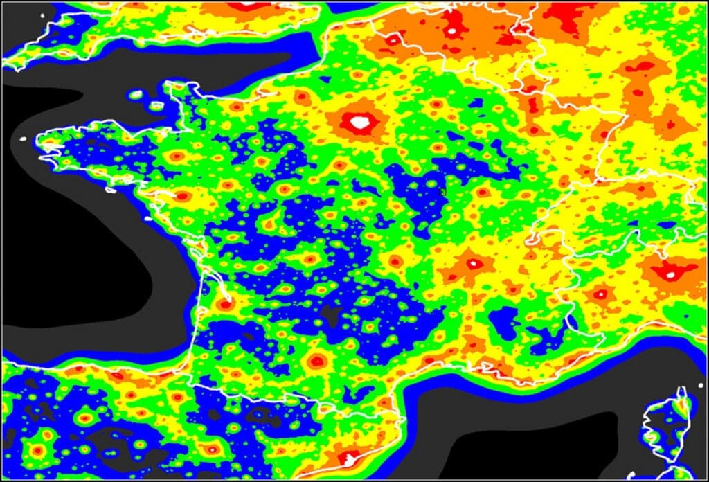 Si vous souhaitez réaliser les meilleures photos astronomiques, il est préférable de rechercher un endroit véritablement sombre. Ceux-ci sont devenus plutôt rares dans nos contrées. Il existe des « cartes de pollution lumineuse ». À titre d'exemple, je vous présente une carte générale de l'Europe occidentale. Les zones bleues sont celles où il n'y a pratiquement pas de pollution lumineuse. Pensez par exemple au sud de la France, à la Bretagne, etc. La première grande zone bleue pour nous, ici en Flandre occidentale et française, est le Morvan en France.