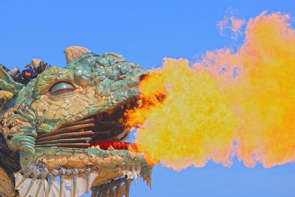 À Calais, vous pouvez voir un véritable monstre (mécanique), un dragon, sur la plage. Créé par la Compagnie du Dragon, il s'agit d'une création impressionnante de 10 à 12 mètres de haut et de 25 mètres de long. À sa naissance, il pesait 72 tonnes. Il peut accueillir jusqu'à 50 passagers par tour. Il est même possible de réserver un tour de manège ! À la vitesse incroyable de pas moins de 4 kilomètres à l'heure, vous descendrez ensuite pendant 45 minutes un tronçon de la digue rénovée de Calais. En chemin, le dragon crache alors du feu et de l'eau (sur les passants et pour le plus grand plaisir des passagers). La bête est pilotée par un équipage de six personnes. Une création unique. Cela fait partie du sommet de ce que l'on appelle"l'art de la performance". En fait, ce dragon est l'attraction du front de mer magnifiquement rénové de Calais. A faire !