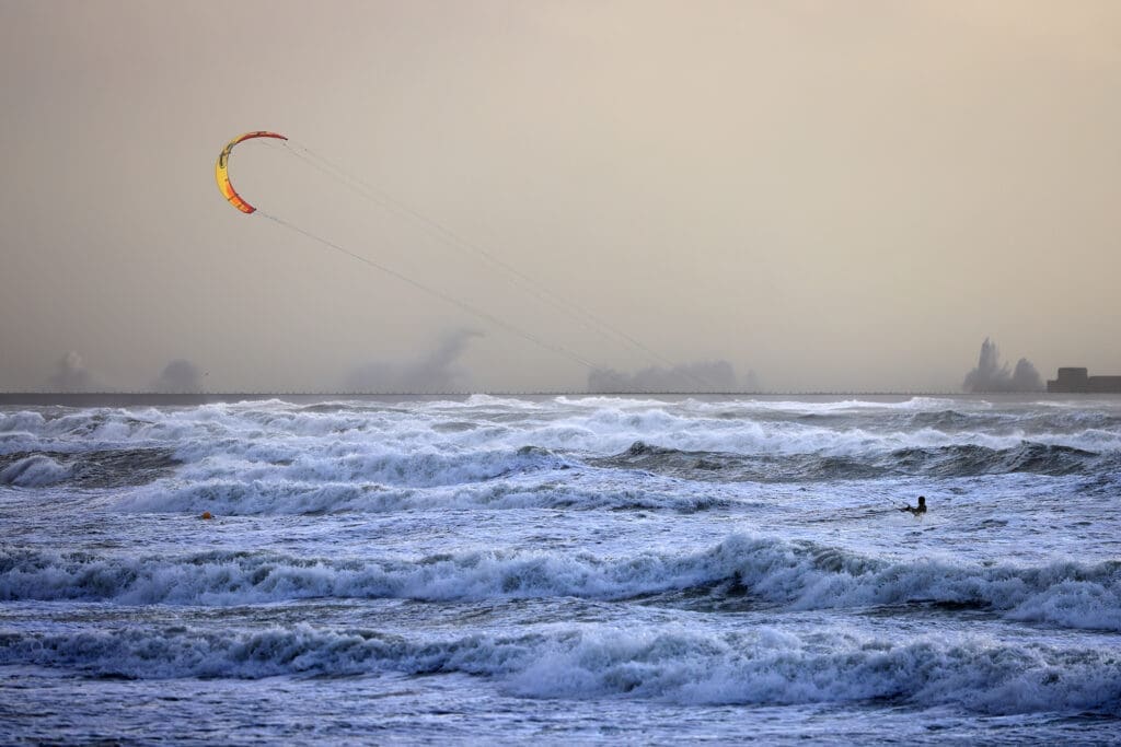 - Het strand van Wimereux (dijk): opspattend water, kitesurfers, …