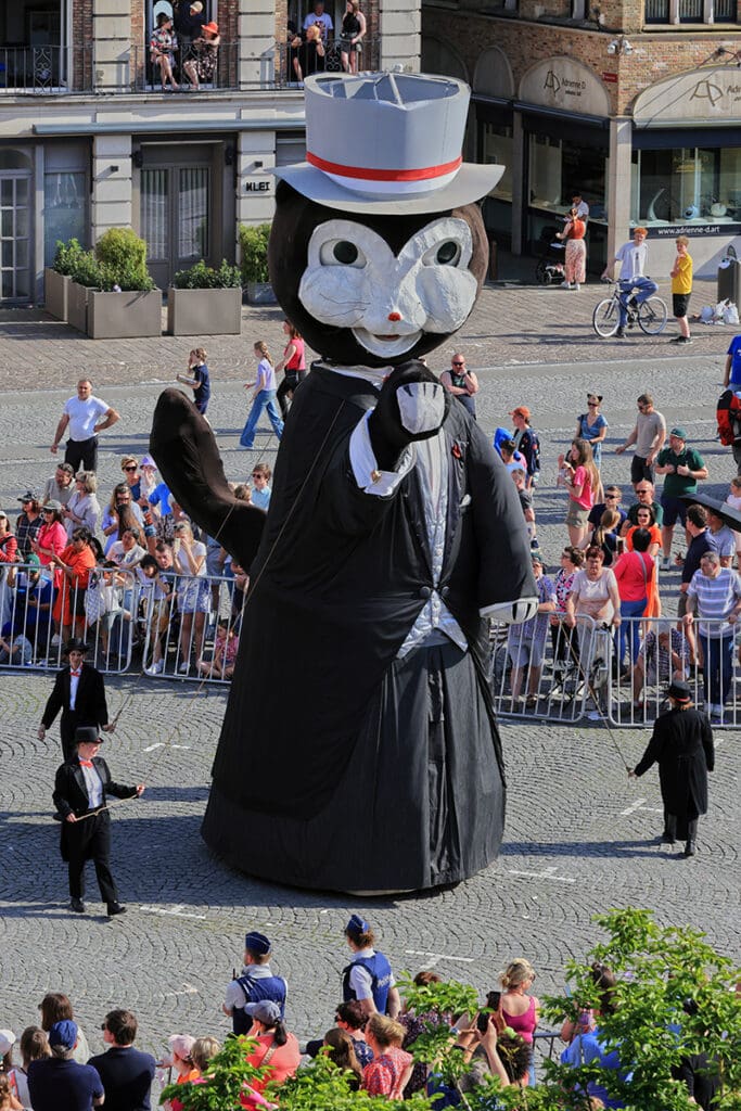 Op het einde van de stoet bestijgt de stadsnar het Belfort en gooit plushen katjes naar beneden. Op Wikipedia lezen we hierover: “Aanvankelijk zou het kattenwerpen hebben plaatsgevonden met de Hemelvaartsfoor vanaf de Sint-Maartenskerk, om in 1476 met de foor te verhuizen naar ‘Kattenwoensdag’ in de tweede vastenweek. De locatie wijzigde naar de belforttoren.“.