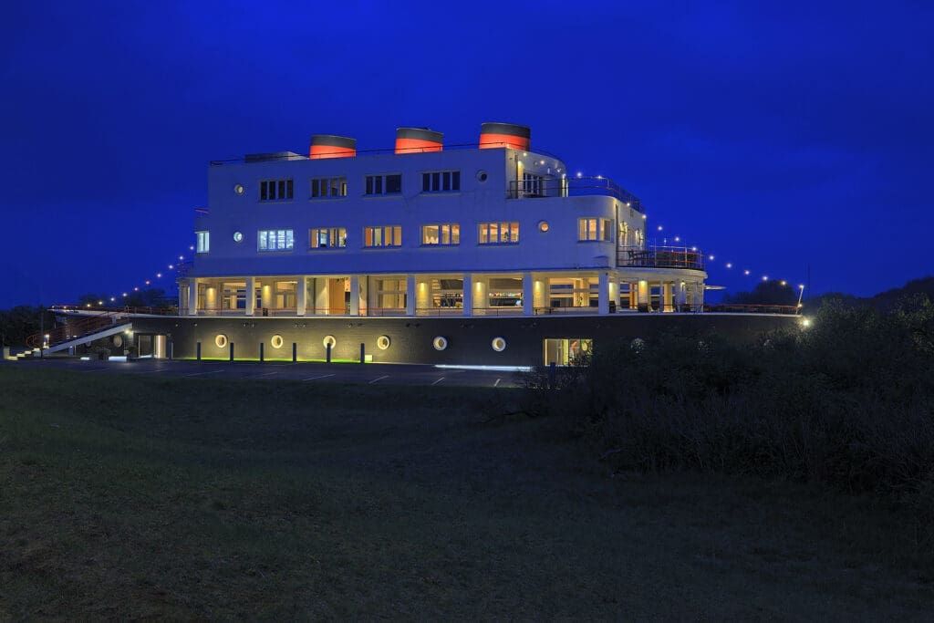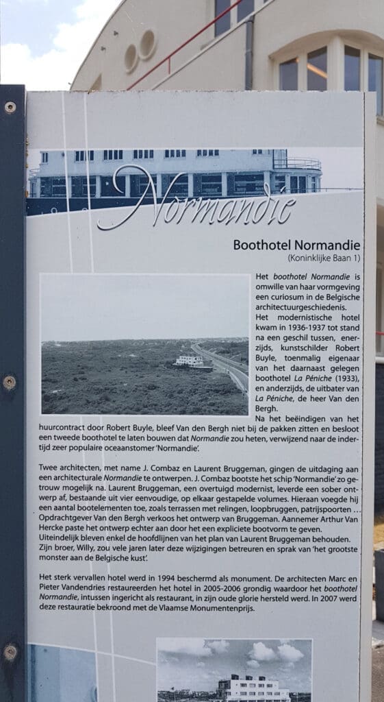 Iedereen die al naar de westkust van België ging kent deze “landmark”: een groot, majestueus (land)schip. Het is het boothotel “Normandie“. Hij dateert van 1936-1937. Hij ligt vlak naast de Koninklijke Baan, dus er naast kijken is zo goed als onmogelijk. Dit gebouw was destijds een hotel, nu een restaurant / brasserie. Vanaf het “dek” heb je een mooi uitzicht op de omringende duinen: de Schipgatduinen en Natuurgebied “Doornpanne“. Mooie plek om tot rust te komen.