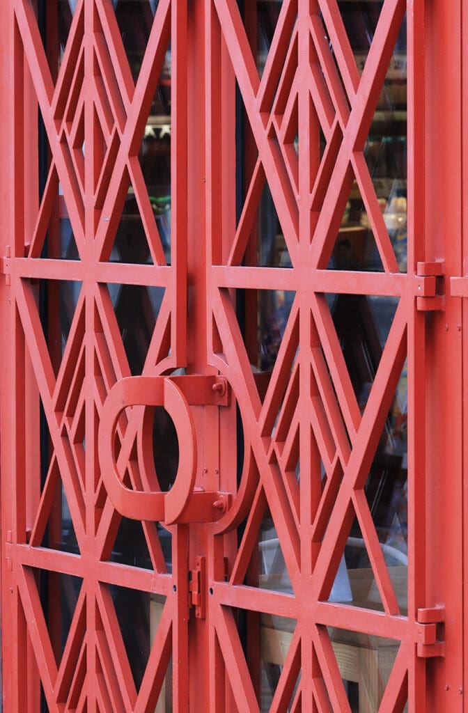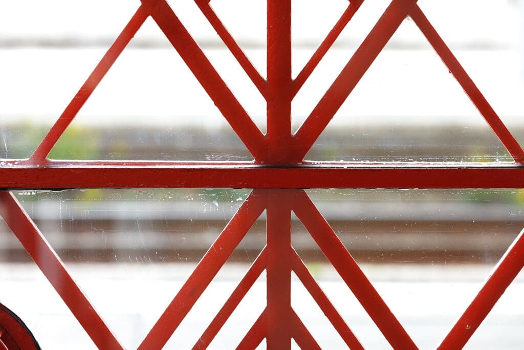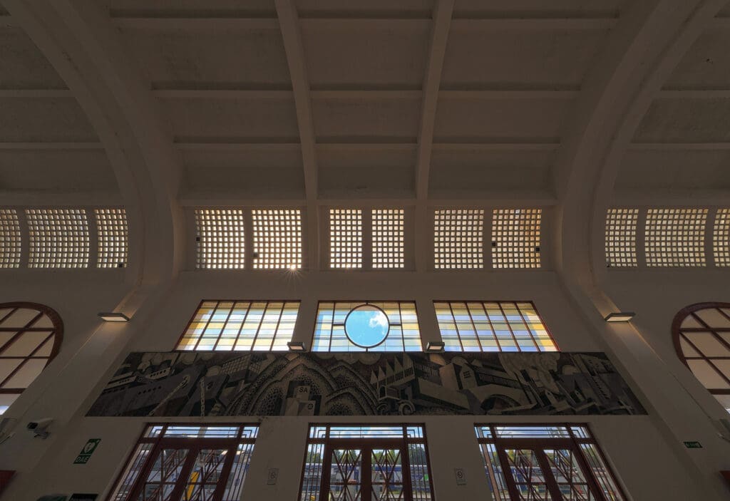 Er is opvallend rood geschilderd smeedwerk. Het plafond van de vertrekhal bestaat uit een betonnen vakwerk met duizenden glastegeltjes. Een mooi ensemble dat zeker een bezoek waard is.