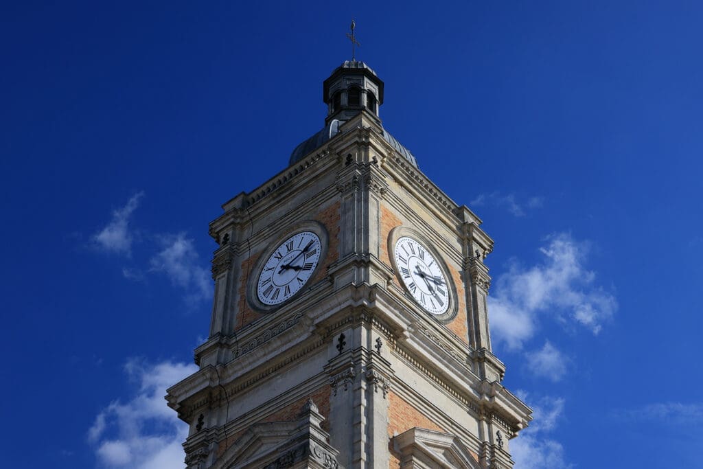 Naast de vertrekhal is er ook nog een 23 meter hoge toren met uurwerk.