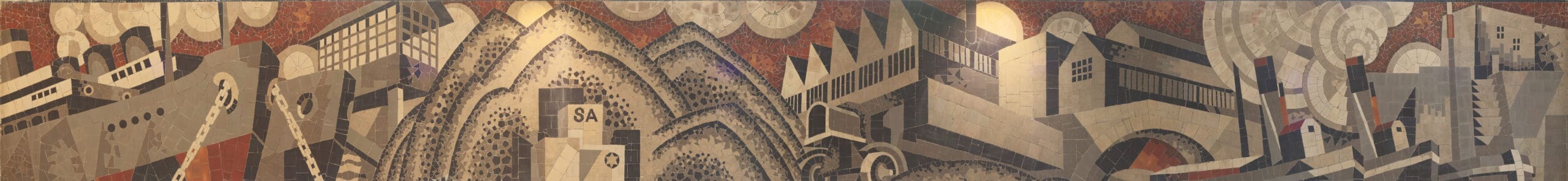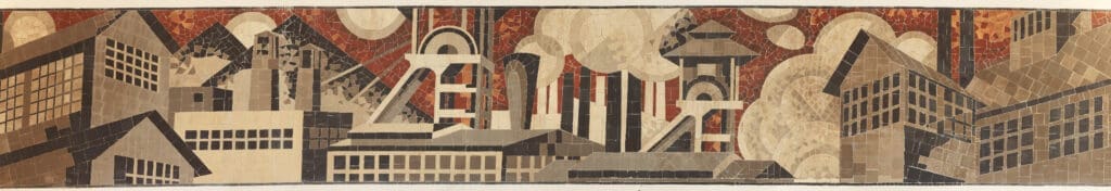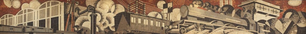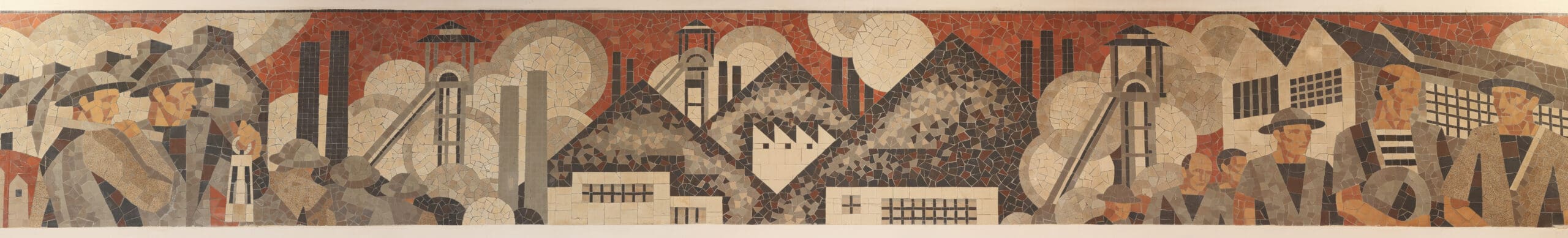 Langs de 4 zijden van de vertrekhal zijn er zeer grote mozaïeken aangebracht. Ze brengen zowel regionale onderwerpen (de steenkoolmijnen met haar terrils en mijnbokken) als industriële (spoorwegwezen bijvoorbeeld).