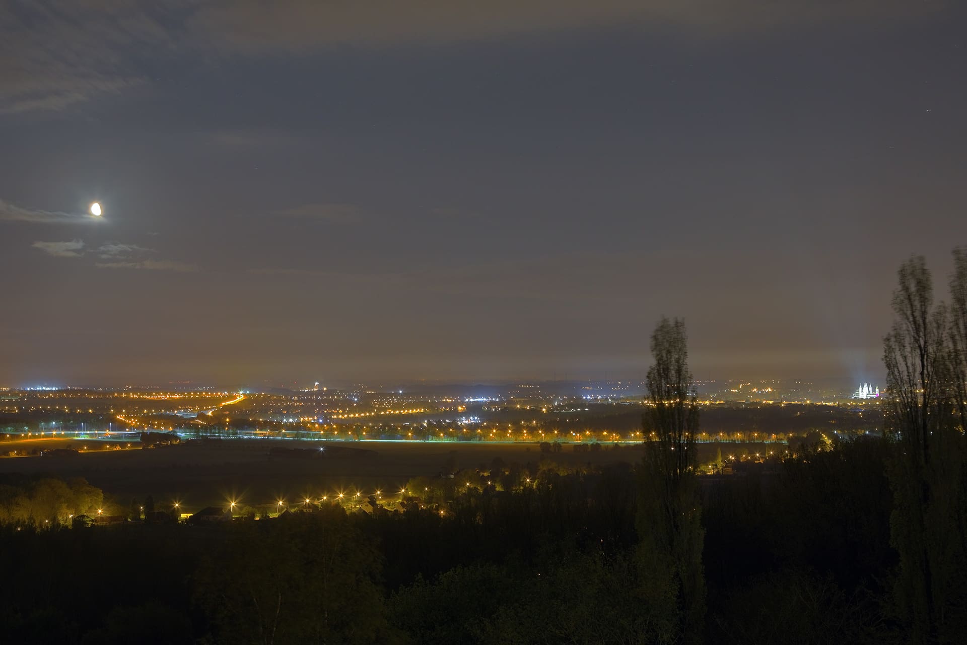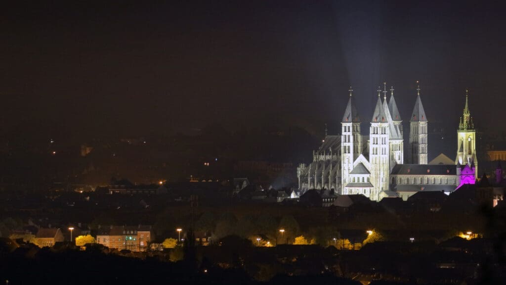 Tip 1: Wil je een heel mooie overzichtsfoto maken van de kathedraal en het landschap er rond, trek dan naar de heuvels rond Doornik. Je kunt hiervoor bijvoorbeeld terecht in het panoramahotel “Le Panoramique” op de Mont Saint-Aubert (ook wel gewoon Floreal Mont-Saint-Aubert geheten). Wil je nachtfoto’s maken zoals wij (zie hieronder onze resultaten), boek dan een kamer aan de valleizijde. Controleer overdag al of je qua zicht goed zit.