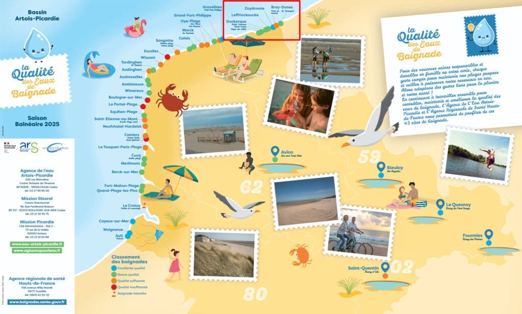 Wist je trouwens dat de kwaliteit van het zwemwater aan het stranden van Les Dunes de Flandre, overal “Goed” of zelfs “Excellent” is? Dit volgens het Regionaal Agentschap voor de Gezondheid (ARS). Enkel het zeewater aan de hulppost van Bray-dunes kreeg de beoordeling “voldoende”. Een pluspunt voor “Les Dunes de Flandre”!