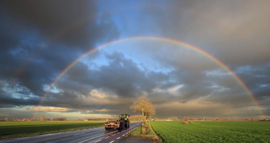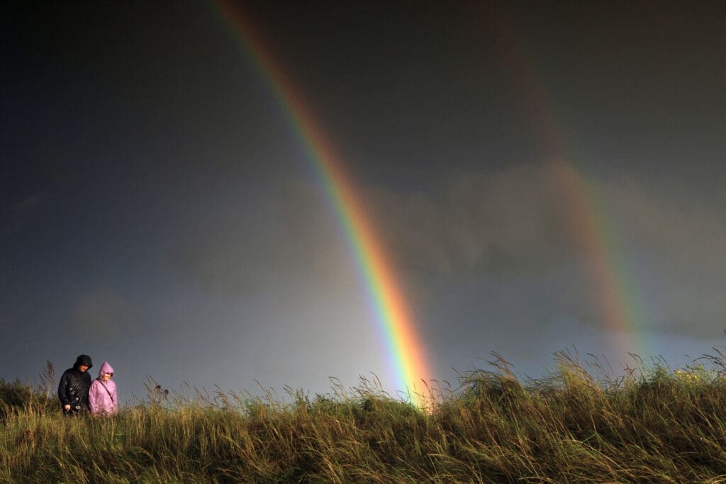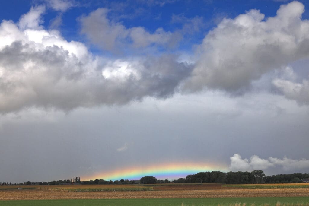 Wil je een contrastrijke foto, dan is de kunst om de verschillende kleuren van de regenboog op een zo klein mogelijk oppervlak in je foto te tonen. Dus fotograferen “van ietskes verder af”. Dus niet met een telelens maar met een 50 mm (standaardlens) of kleinere brandpuntsafstand.