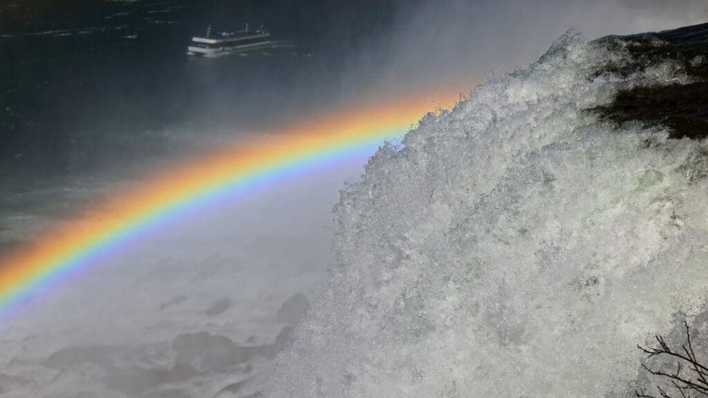 Jazeker bestaan er regenbogen die niet aan de hemel staan. Denk maar eens aan een waterval. Gebaseerd op dezelfde principes ontstaan deze regenbogen door waterdruppels die zich boven de waterval vormen en door de Zon worden beschenen. Eén van de grootste watervallen ter wereld zijn de Niagara watervallen in de VSA. Hierbij een tweetal voorbeelden van foto’s die er werden gemaakt van de regenboog boven de Niagara watervallen (aan de Amerikaanse zijde gefotografeerd).