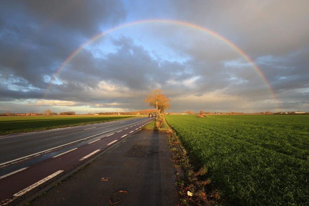 Wanneer je een polarisatiefilter gebruikt bekom je meer verzadigde kleuren. Dat is algemeen bekende materie bij landschapsfotografen. Velen van hen gebruiken dan ook zo’n filter quasi standaard. Een regenboog zal je ook door een polarisatiefilter blijven zien. Weet echter wel dat wanneer je aan de circulaire polarisatiefilter draait dat dan wel slechts een stuk, jawel enkel één stukje, van de hele regenboog zal verdwijnen. Wanneer je draait aan je filter zul je dus opmerken dat steeds maar weer een ander stuk van de regenboog verdwijnt. Dat is wellicht niet de bedoeling… we willen toch net de regenboog wèl in haar totaliteit vastleggen, niet?
