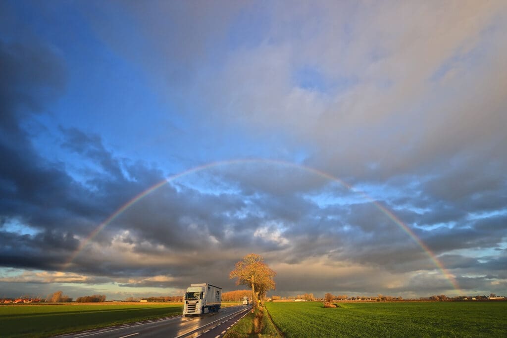 Wil je horizonbreed een volledige regenboog vastleggen dan zal je een ultrabreedhoek moeten gebruiken. Een volledige regenboog kun je al in een full frame camera vastleggen met een 13 à 14 mm.
