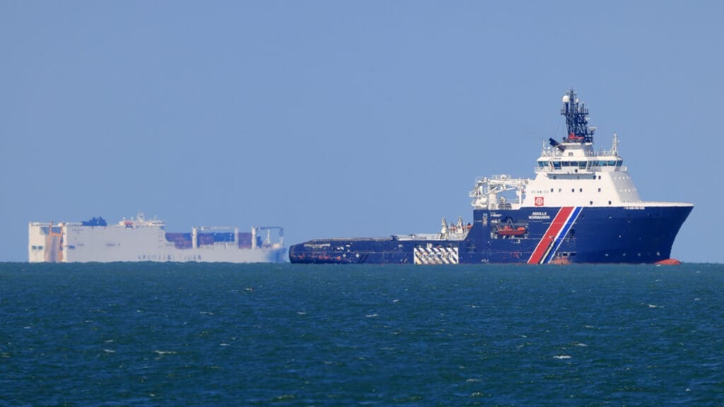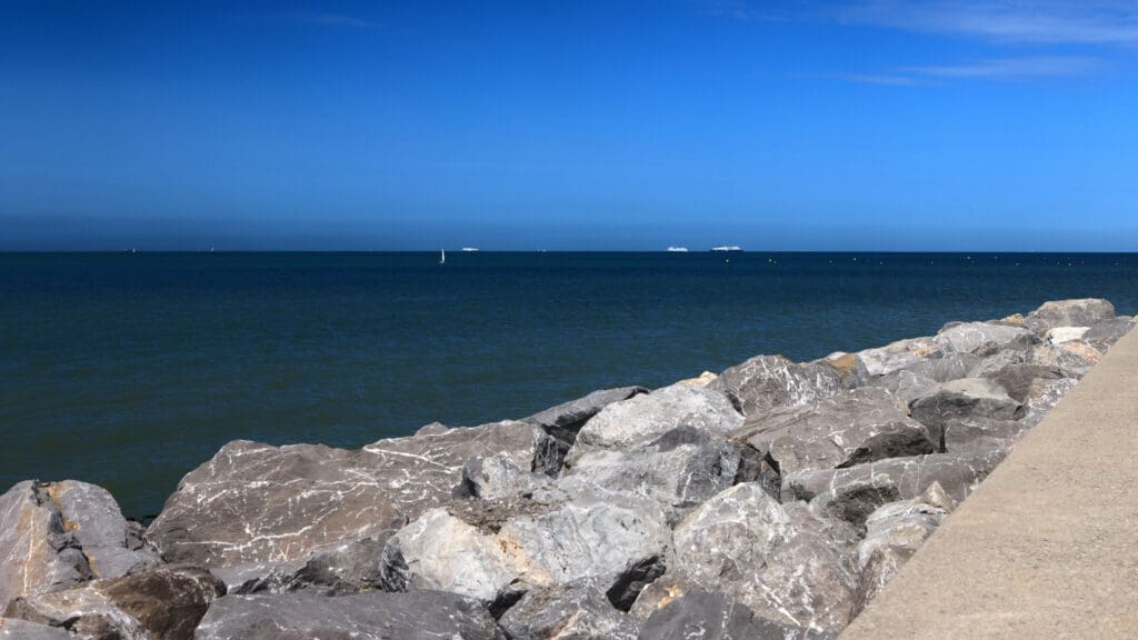 Vanaf de dijk kun je heel goed de Cap Blanc-Nez zien. Af en toe zie je er ook de grote sleepboot/reddingsschip “Abeille Normandie” liggen. Deze is altijd stand-by voor het geval dat schepen of mensen in moeilijkheden geraken op “Het Kanaal” / “Het nauw van Kales”. Wist je dat wij een lijst bijhouden van zo’n populaire schepen in Vlaamse wateren?