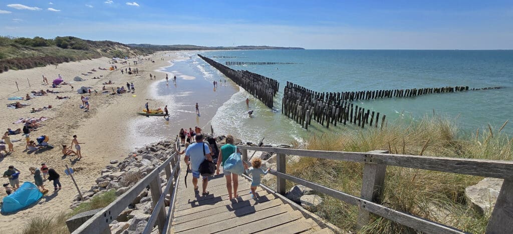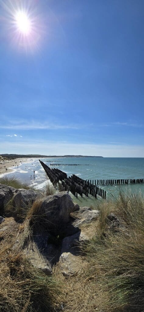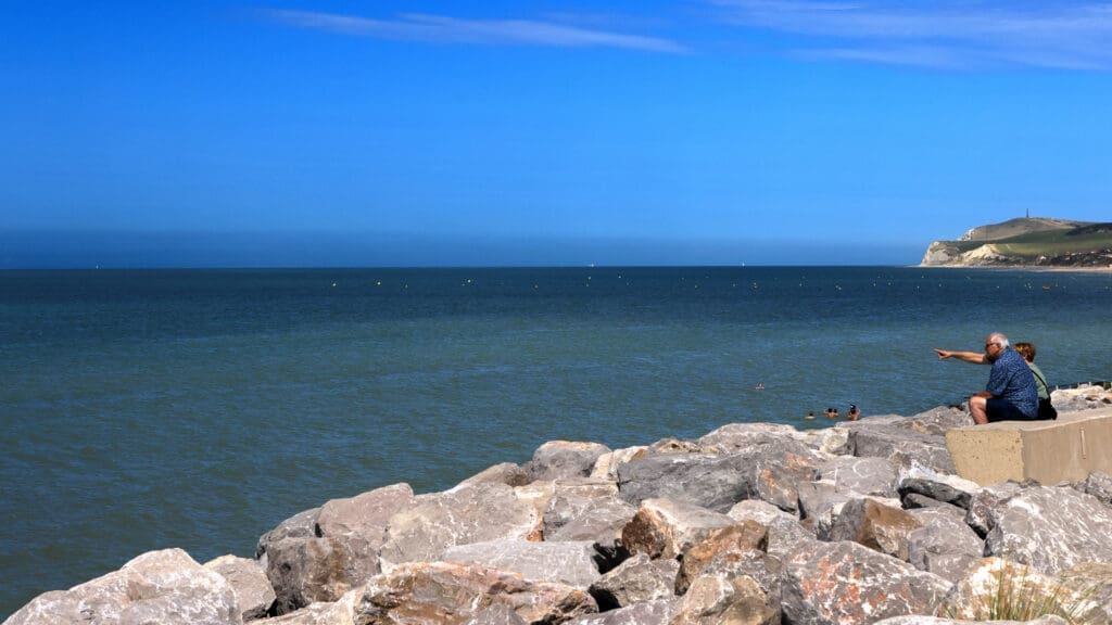 De dijk ziet er op het eerste zicht nogal beton- en rotsachtig en strak uit, maar vergis U niet: op de beide uiteinden van deze dijk bevinden zich échte zandstranden waar je kunt gaan zwemmen. Aan de Westelijke kant van de zeedijk heb je een zeer goed uitzicht op de baai. Er staan ook talrijke zitbanken waar je rustig alles kunt gadeslaan. Daar bevindt zich ook dé meest iconische zitbank van heel de Opaalkust: ze is te zien op duizenden foto’s. Niet te verwonderen dat ze… meestal bezet is. 😉 Locatie van deze zitbank: Google Maps.