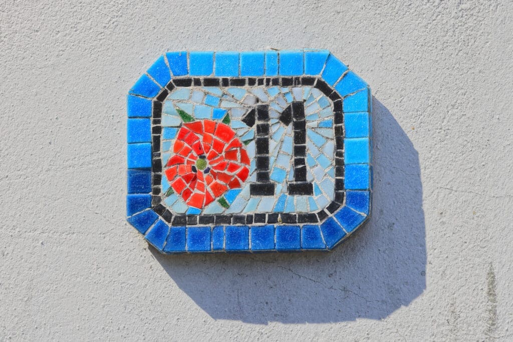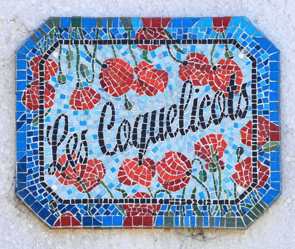 Foto’s van mozaïek op huis met zee & klaprozen (Rue du Professeur Leloir 11, Wissant)
