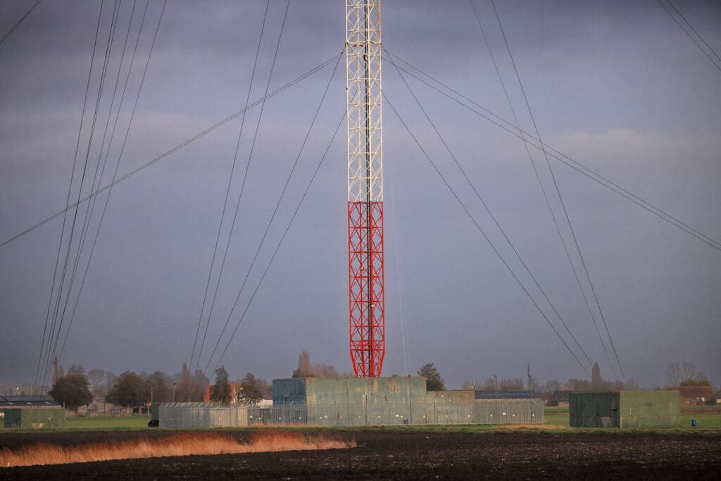 De zendmast in Houtem is een “guyed mast” — dat wil zeggen: een hoge metalen toren die gestabiliseerd wordt met 48 staalkabels (ook wel “guy-wires” genoemd) die in de grond verankerd zijn. De mast is onderaan smal: alles rust op een ring, met een doormeter van amper 20 cm, op een betonnen blok. We telden 4 keer 2, dus 8 ankerpunten: dit zijn zéér grote betonnen blokken. Per ankerpunt zijn er 6 tuikabels. Deze blokken gaan tot 15 meter diep in de grond wat ook nodig is gezien de natte ondergrond. De Moeren waren ooit eens moerasgebied, nadien weliswaar grotendeels drooggelegd, maar toch.