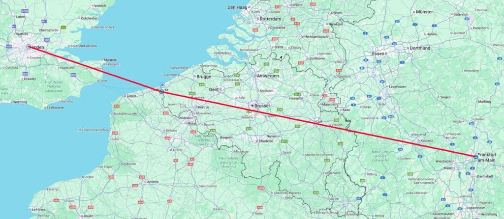 Onderstaande kaart toont je duidelijk aan dat de zendmast heel goed gelegen is tussen Londen en Frankfurt. Waarom ze Londen en Frankfurt niet zonder tussenstation in Houtem verbinden ? Heel simpel: de Aarde is rond. Voor Londen ligt Frankfurt onder de horizon (en omgekeerd). Door een zeer hoog tussenstation te kiezen kan je het probleem van de kromming van de Aarde oplossen. Goed gezien hé? 😉