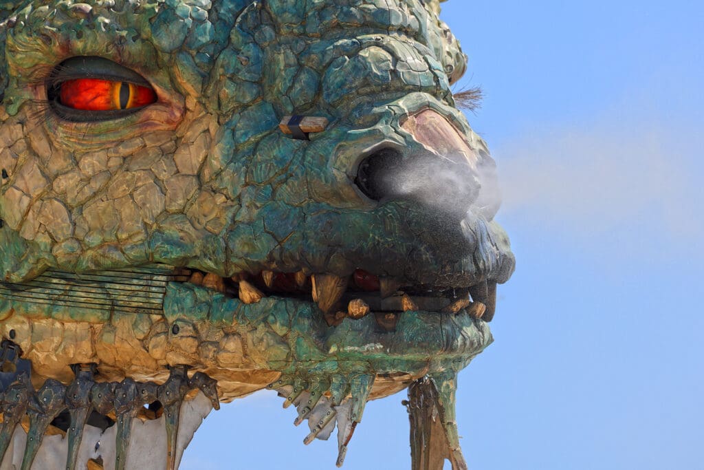 In Calais kun je aan het strand een écht (mechanisch) monster, een draak, zien. Deze werd gemaakt door de Compagnie du Dragon en is een indrukwekkende creatie van 10 tot 12 meter hoog en 25 meter lang. Bij de geboorte woog de baby 72 ton. Ze biedt plaats aan maximaal 50 passagiers per rit. Jawel, je kunt er dus zelfs een ritje voor boeken! Aan de ongelooflijke snelheid van maar liefst 4 kilometer per uur rijd je dan gedurende 45 minuten een stukje van de vernieuwde zeedijk van Calais af. Onderweg spuwt de draak dan vuur en water (op voorbijgangers en tot groot jolijt van de passagiers). Het gevaarte wordt bestuurd door een ploeg van 6 medewerkers. Unieke creatie. Dit behoort tot de top van het zogeheten “Performance Art“. Eigenlijk is deze draak dé publiekstrekker van de mooi vernieuwde zeedijk van Calais. Doen!
