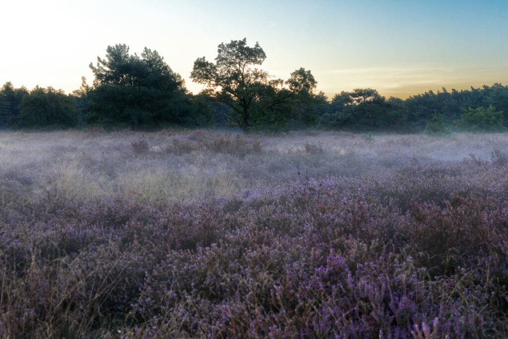 Tip: probeer er vroeg in de ochtend te zijn. Wanneer er een lichte mist hangt over de heide zijn er bijzonder mooie foto’s te maken. Wel op tijd er bij zijn want een opkomende Zon doet snel het mistspektakel vlugger verdwijnen dan je denkt.